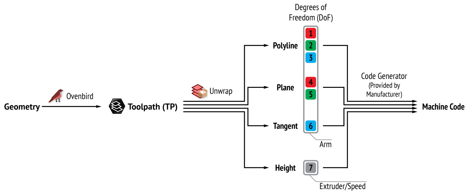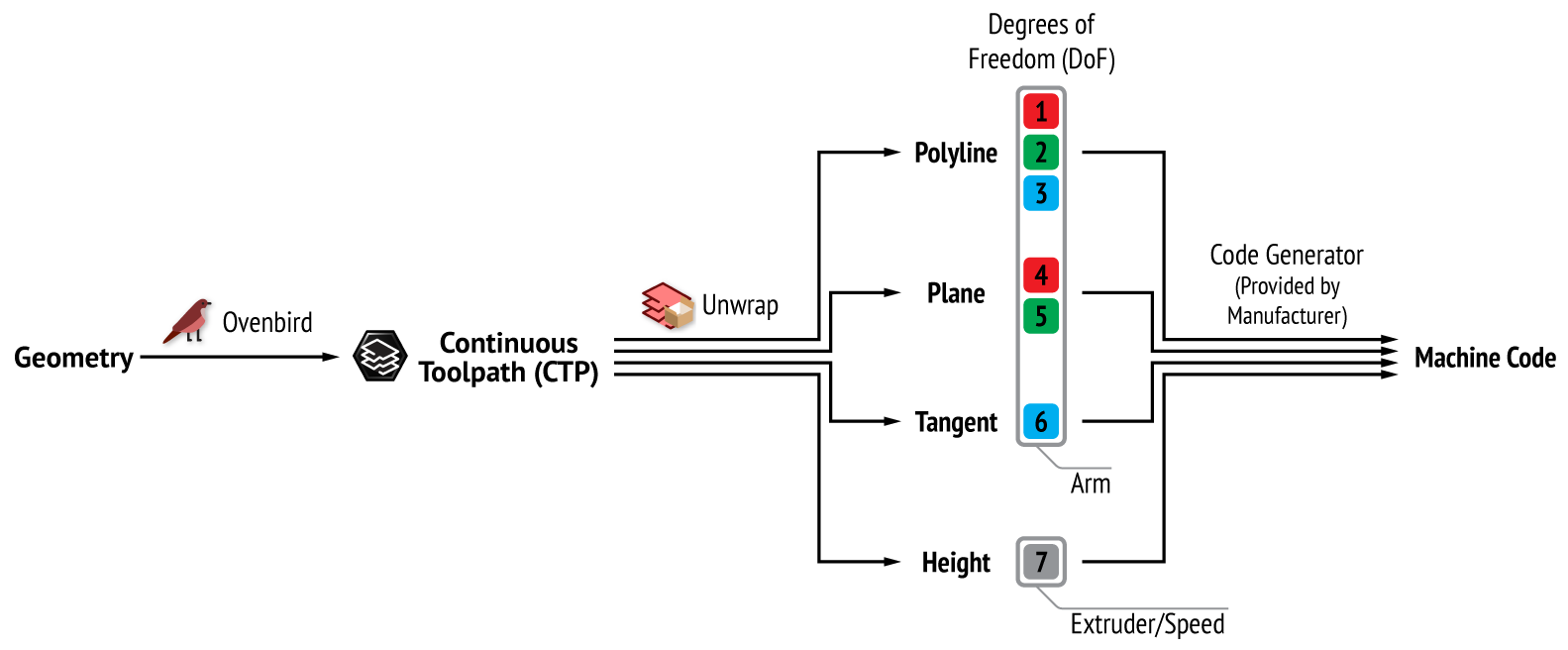 Ovenbird does not directly produce machine codes for robots/gantries since they are setup-dependant. The printing team typically receive from the extruder's manufacturer a Grasshopper file that converts geometry into machine codes.