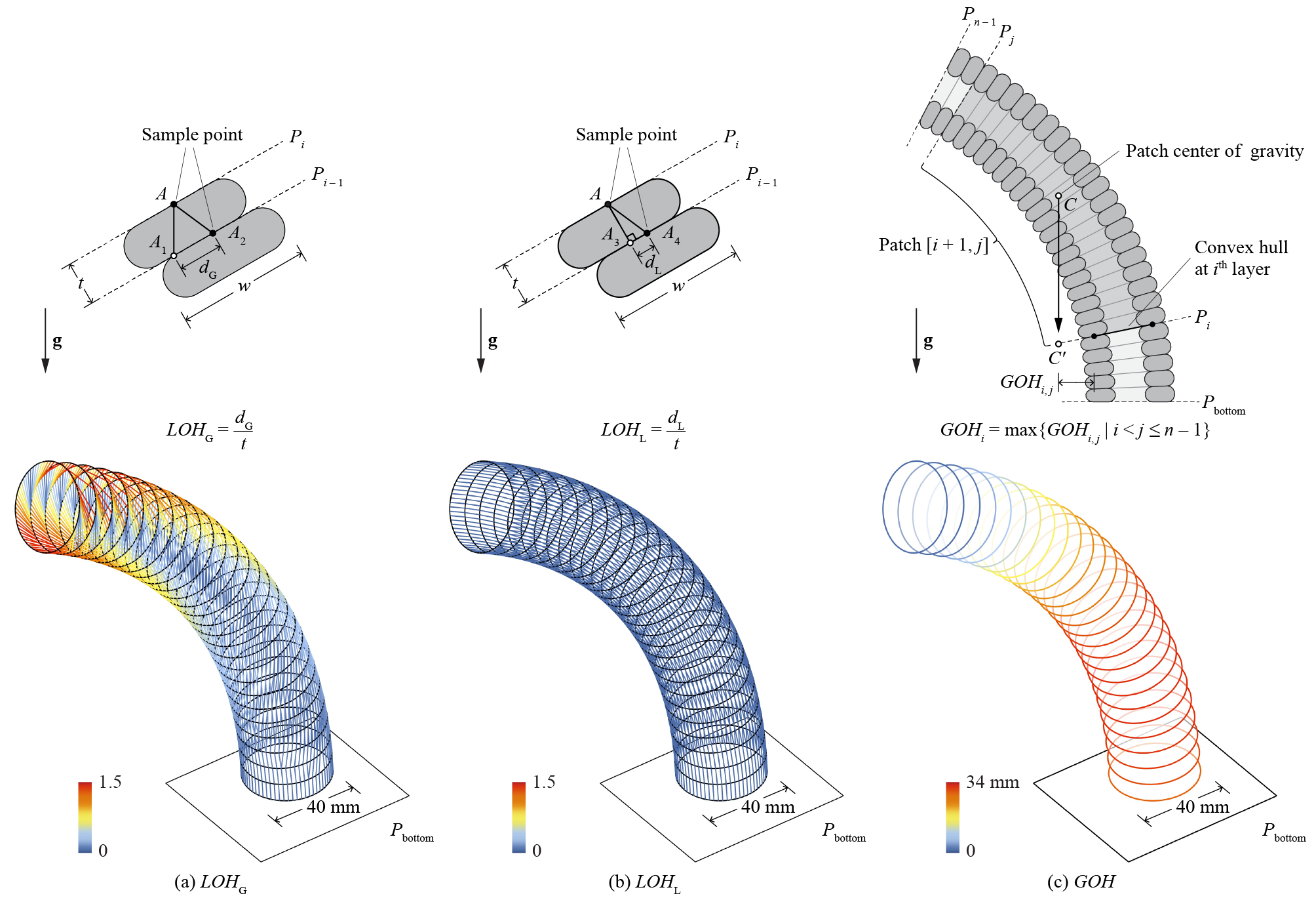 Local overhang by layer (\(L O H_\mathrm{L}\)), on the other hand, orients the sample points from the current nozzle plane to the previous nozzle plane and then calculates the local overhang in the same way. \(L O H_\mathrm{L}\) measures the discontinuation of the toolpaths across adjacent layers. If we assume the material does not slump within the same layer and the friction between layers is sufficient, then \(L O H_\mathrm{L}\) is a better criterion for determining buildability.