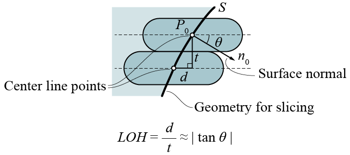 The local overhang (\(L O H\)) is a property of a sample point. Two types of local overhangs differ in non-parallel/rotary slicing: