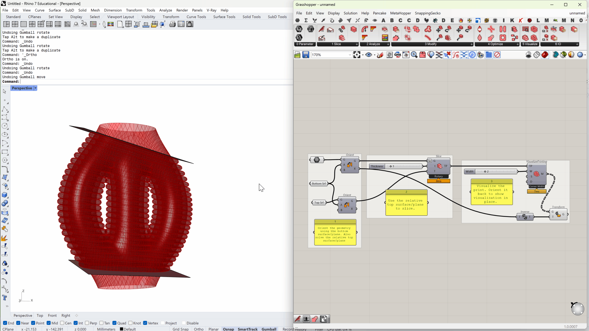 Slice component accepts a list of Breps and/or Meshes and slices them on the World XY plane (\(z = 0\)). Therefore, your geometry should be place upright on the World XY plane for slicing. (1) If the geometry is upright but floating (\(z\neq0\)), you can check Right Click → Use bounding bed for a quick slicing/visualization.