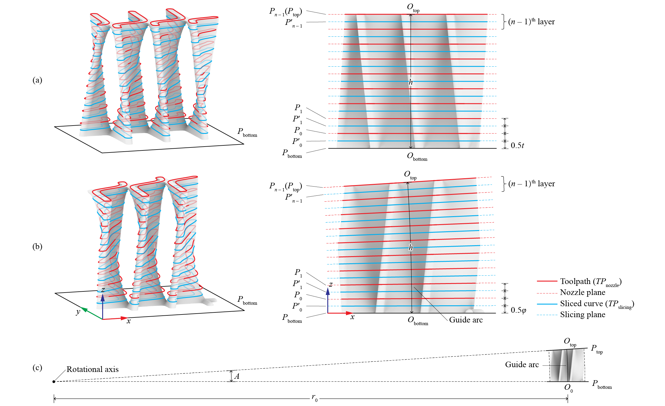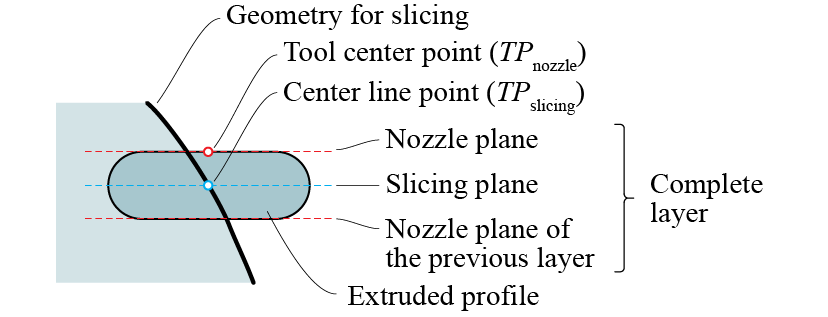 The slicing plane is the bisecting plane between the bottom and top nozzle planes. It hosts the center lines of the extrusion. Therefore, the toolpath curves \(TP_\mathrm{slicing}\) are solved by intersecting the slicing plane with the input geometry. However, in printing, the trajectory of the tool center point (TCP), or the tip of the nozzle, is on the nozzle plane. Therefore, \(TP_\mathrm{slicing}\) is oriented from the slicing plane to the nozzle plane to form \(TP_\mathrm{nozzle}\) as the actual "Tool-Path".